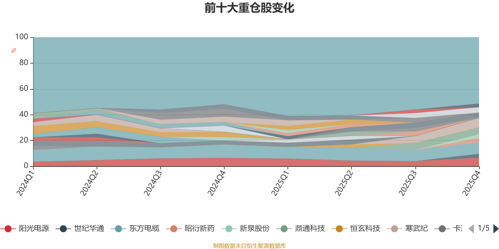 截至2025年末,基金十大重仓股分别是东方电缆、寒武纪、阳光电源、鼎通科技、大金重工、三花智控、昭衍新药、世纪华通、海光信息、新泉股份。