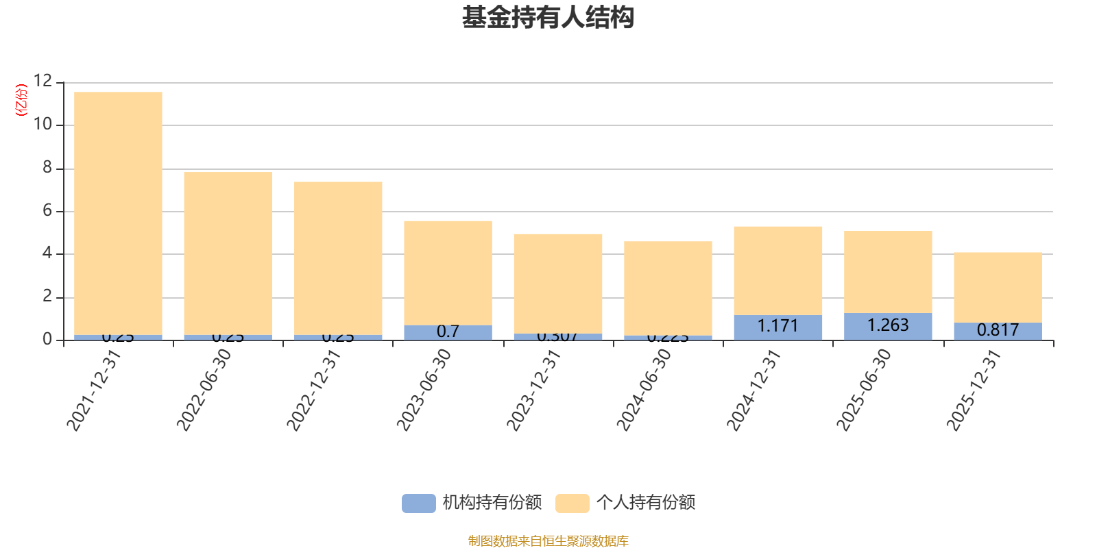 截至2025年12月31日,基金持有人共计3601户,合计持有4.08亿份。其中管理人员工持有68.38万份,占比0.17%,机构持有份额占比20.03%,个人投资者占比79.97%。