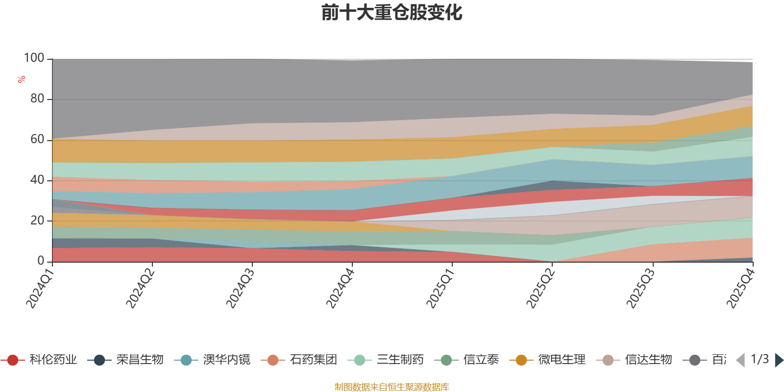 该基金持股集中度较高,近2年前十大重仓股集中度长期超过60%。截至2025年末,基金十大重仓股分别是科伦博泰生物-B、信达生物、恒瑞医药、三生制药、石药集团、海思科、泽璟制药、百利天恒、热景生物、荣昌生物。