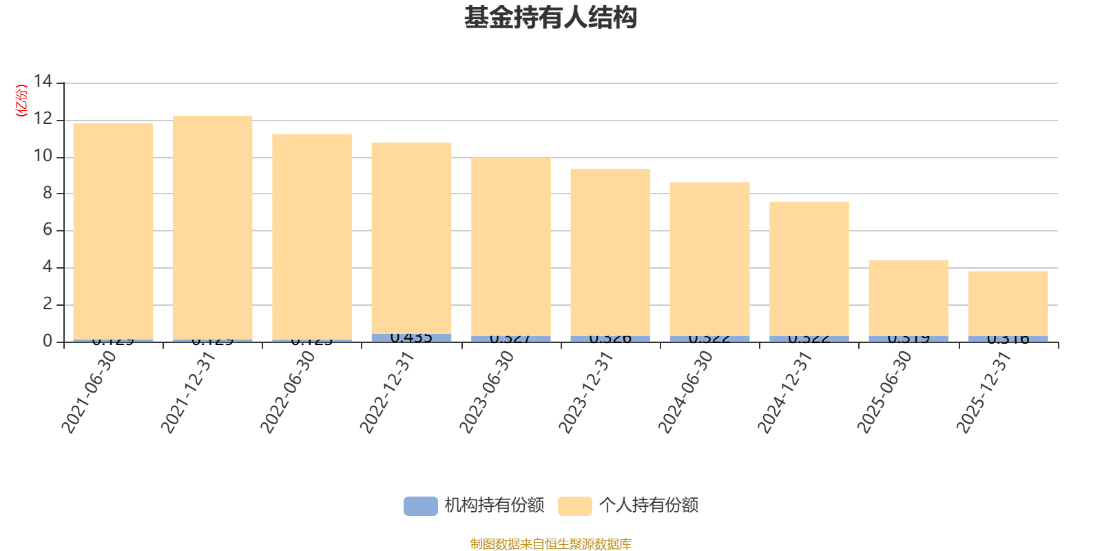 截至2025年12月31日,基金持有人共计1.27万户,合计持有3.81亿份。其中管理人员工持有1056.31万份,占比2.77%,机构持有份额占比8.29%,个人投资者占比91.71%。