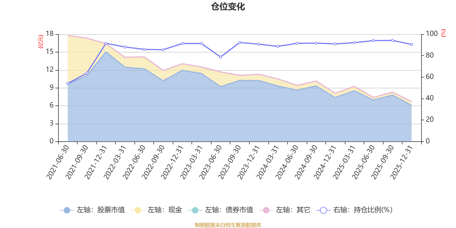 据定期报告数据统计,近三年平均股票仓位为90.55%,同类平均为86.7%。2025年三季度末基金达到94.21%的最高仓位,2021年上半年末最低,为54.08%。