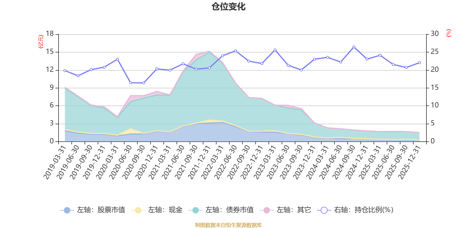 据定期报告数据统计,近三年平均股票仓位为22.8%,同类平均为72.57%。2024年三季度末基金达到26.44%的最高仓位,2020年三季度末最低,为16.38%。