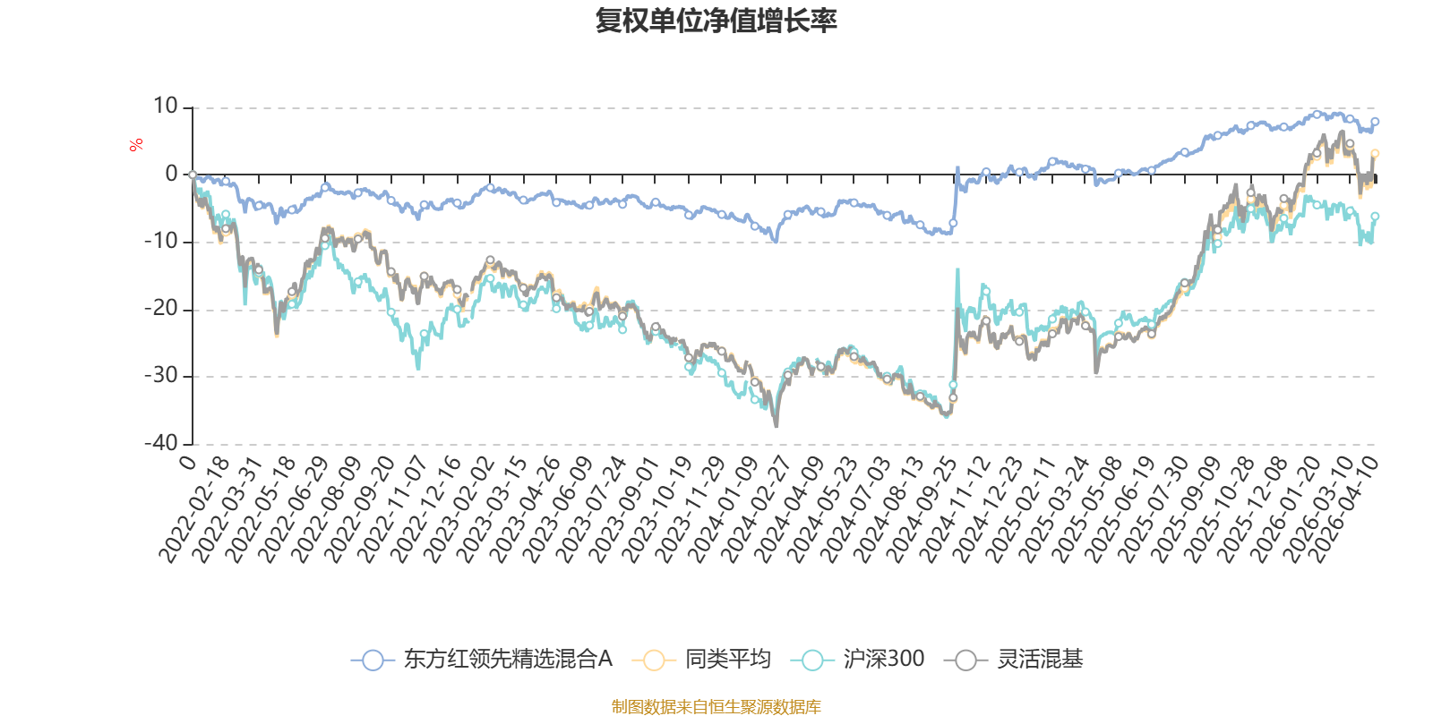 截至4月10日,东方红领先精选混合A近三个月复权单位净值增长率为-0.55%,位于同类可比基金721/1287;近半年复权单位净值增长率为0.93%,位于同类可比基金904/1286;近一年复权单位净值增长率为8.65%,位于同类可比基金1064/1286;近三年复权单位净值增长率为11.07%,位于同类可比基金735/1286。