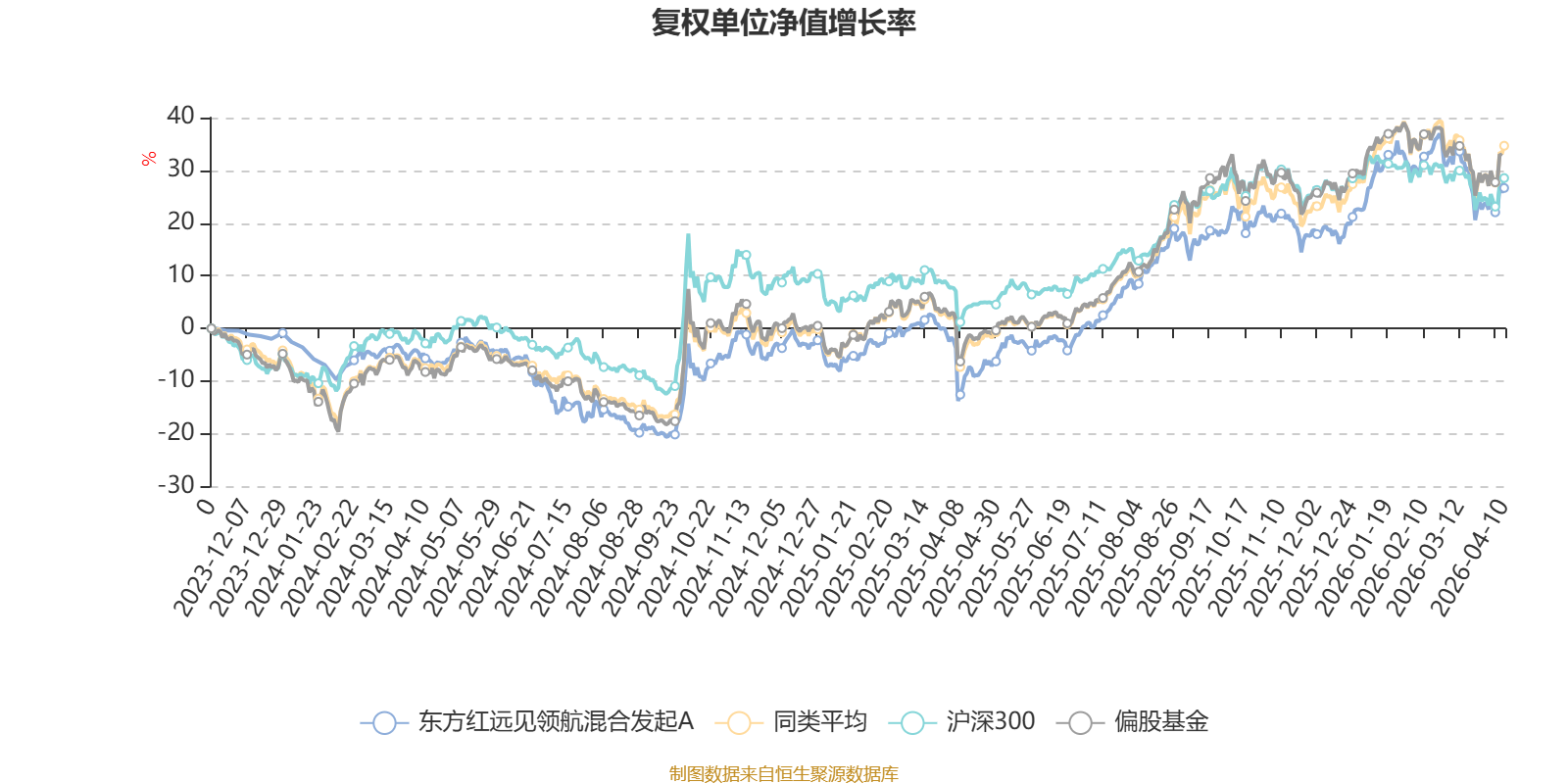 截至4月10日,东方红远见领航混合发起A近三个月复权单位净值增长率为-2.29%,位于同类可比基金434/689;近半年复权单位净值增长率为3.53%,位于同类可比基金368/689;近一年复权单位净值增长率为39.36%,位于同类可比基金312/685。