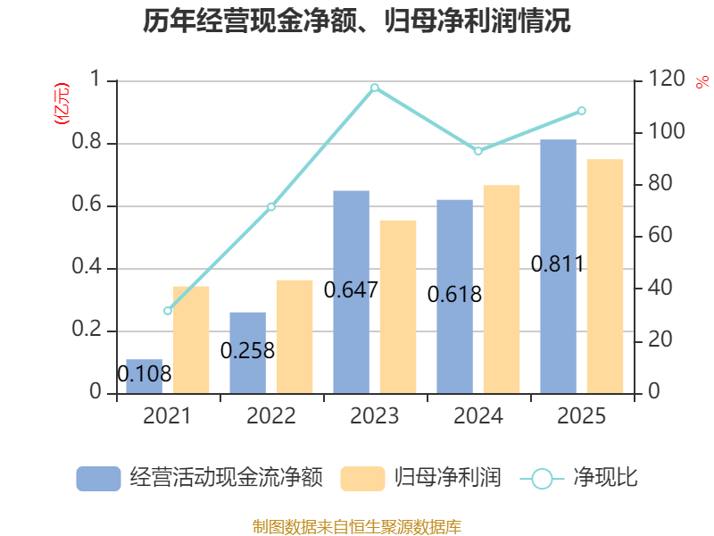 截至2025年,公司经营活动现金流净额为8105.04万元,同比增长31.14%;筹资活动现金流净额-2082.65万元,同比增加307.48万元;投资活动现金流净额-2251.23万元,上年同期为-1254.24万元。