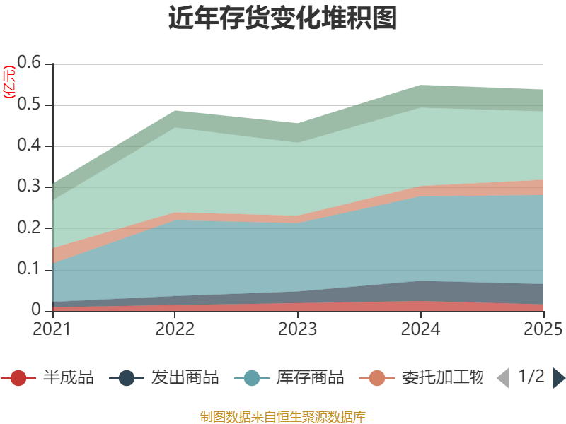 从存货变动来看,截至2025年末,公司存货账面价值为5370.66万元,占净资产的18.91%,较上年末减少99.95万元。其中,存货跌价准备为1406.17万元,计提比例为20.75%。