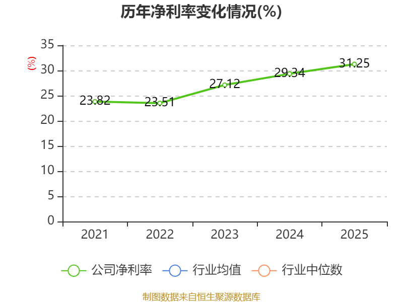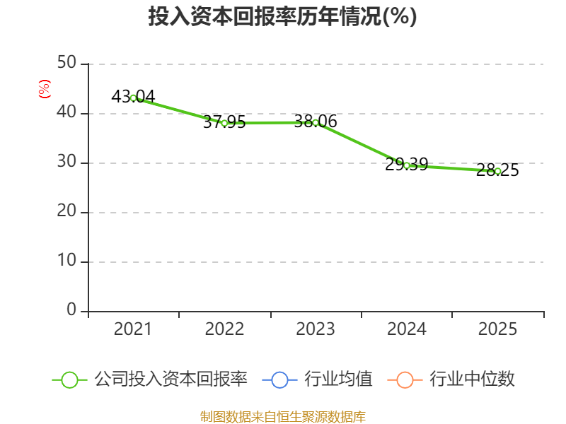数据显示,2025年公司加权平均净资产收益率为30.34%,较上年同期下降6.04个百分点。公司2025年投入资本回报率为28.25%,较上年同期下降1.14个百分点。