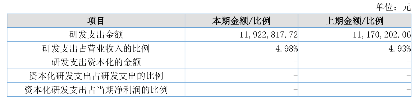 2025年全年,公司研发投入金额为1192.28万元,同比增长6.74%;研发投入占营业收入比例为4.98%,相比上年同期上升0.05个百分点。