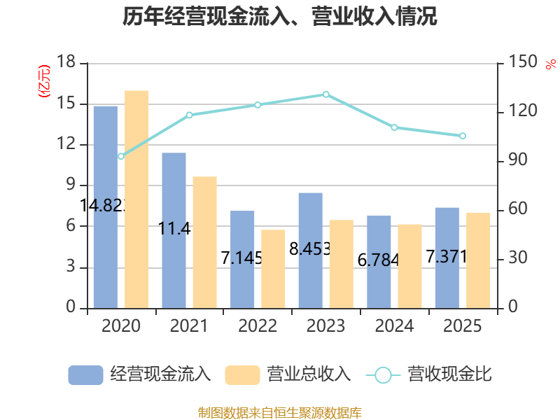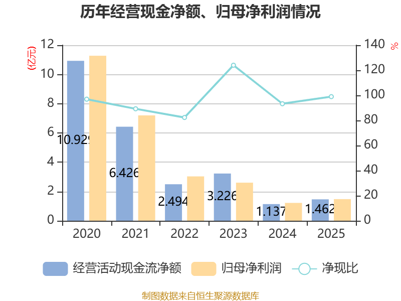 截至2025年,公司经营活动现金流净额为1.46亿元,同比增长28.54%;筹资活动现金流净额-6.39亿元,同比增加1亿元;投资活动现金流净额4.32亿元,上年同期为-4.36亿元。