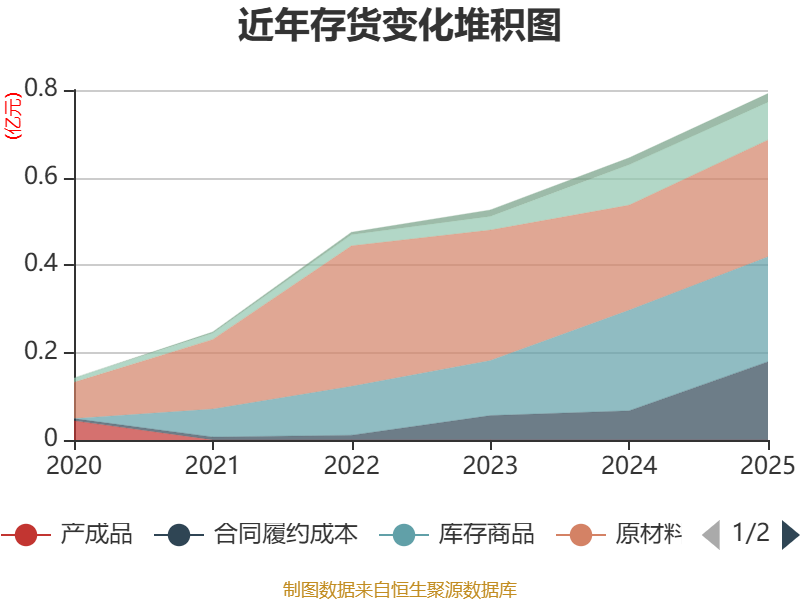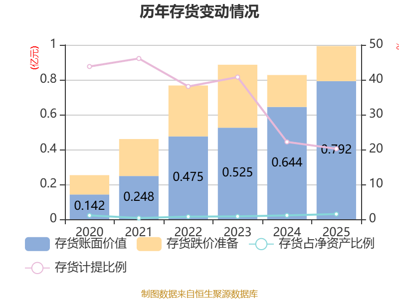 从存货变动来看,截至2025年末,公司存货账面价值为7921.6万元,占净资产的1.49%,较上年末增加1481.59万元。其中,存货跌价准备为2006.36万元,计提比例为20.21%。