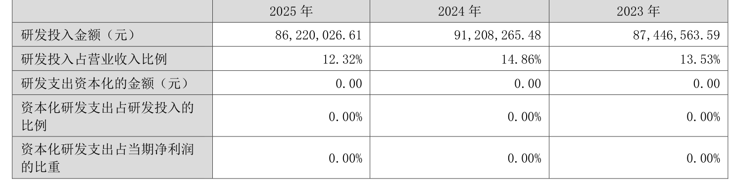 2025年全年,公司研发投入金额为8622万元,同比下降5.47%;研发投入占营业收入比例为12.32%,相比上年同期下降2.54个百分点。此外,公司全年研发投入资本化率为0%。