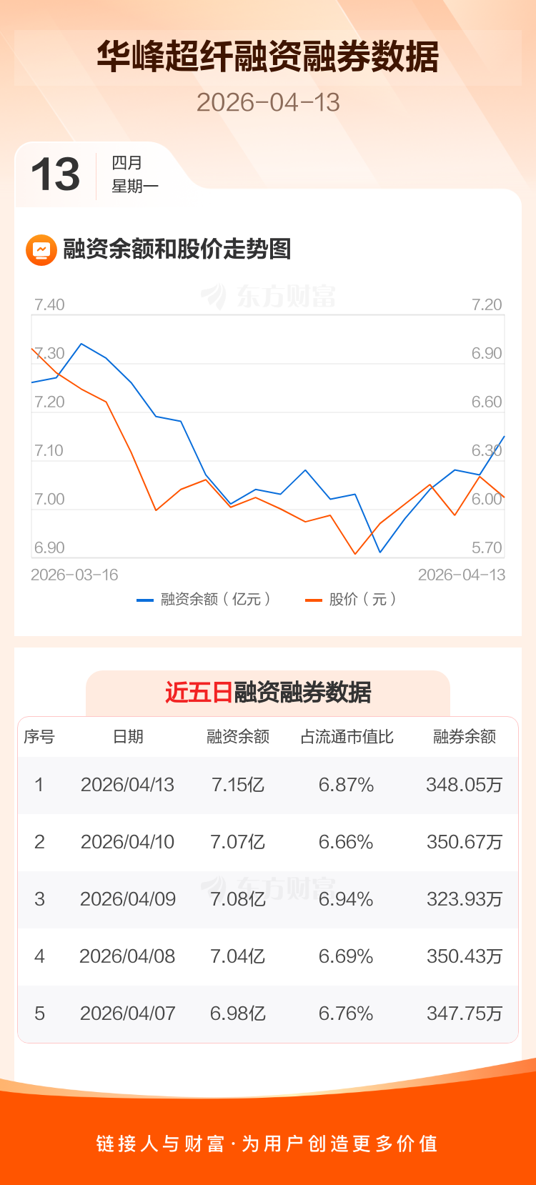 交易所最新数据显示,华峰超纤于2026年4月13日获融资买入2995.59万元,融资偿还2231.48万元,当日融资净买入764.11万元。目前,该股融资余额7.15亿,占流通市值比例为6.87%。