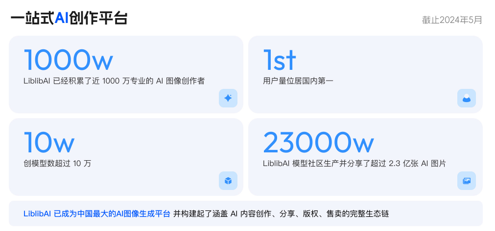 官网显示,该公司是一家专注于AI与创意生产的科技公司,聚焦图像、视频、设计等多模态场景,构建真正面向未来的 AI-Native 创作基础设施。截至2024年5月,LiblibAl已经积累了近1000万专业的Al图像创作者,用户量位居国内第一。
