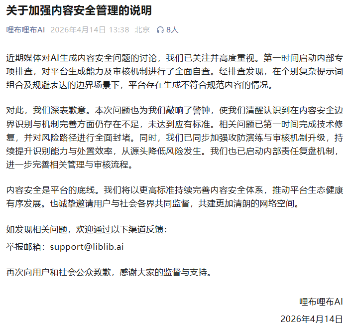 4月14日,哩布哩布AI发布关于加强内容安全管理的说明。