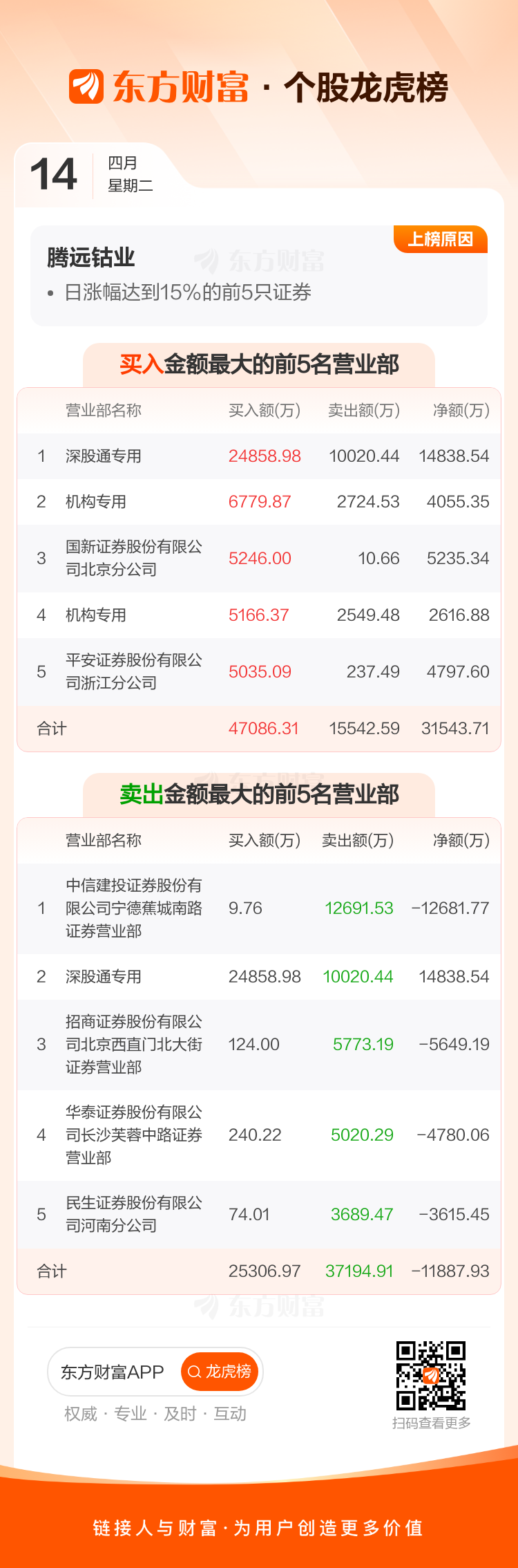 交易所2026年4月14日公布的交易公开信息显示,腾远钴业因成为日涨幅达到15%的前5只证券上榜。腾远钴业当日收报82.02元,涨跌幅20.00%,偏离值20.00%,换手率12.53%,成交额29.10亿。