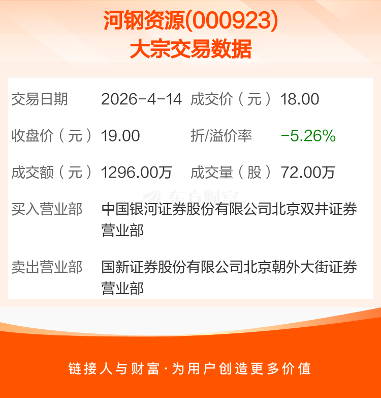 2026年4月14日,河钢资源发生1笔大宗交易,共成交72.00万股,成交金额1296.00万元,占其流通市值比例为0.11%。