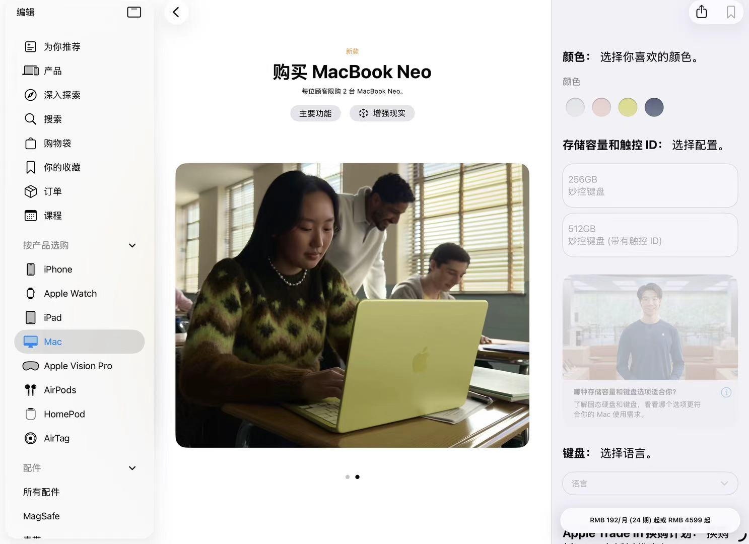 4月14日,界面新闻查询苹果官方App store获悉,MacBook Neo每位顾客限购2台,目前因售罄暂时不能订购。以8G+256G为例,售价4599元,苹果线上官方商店提供免息分期服务,如果分期24期,每月仅需支付192元。