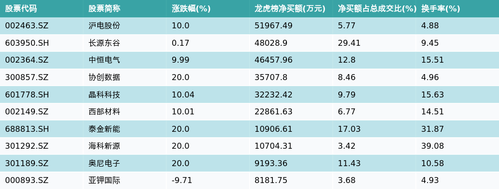 南财智讯4月14日电,盘后数据显示,因当日异动登上龙虎榜的个股中,资金净买入最多的前三位分别是沪电股份(002463.SZ)、长源东谷(603950.SH)与中恒电气(002364.SZ)。其中排名第一的沪电股份净买额达5.2亿元,占总成交金额的5.77%。沪电股份当日收盘上涨10.0%,换手率为4.88%,净买入额前10个股详情见下图:
