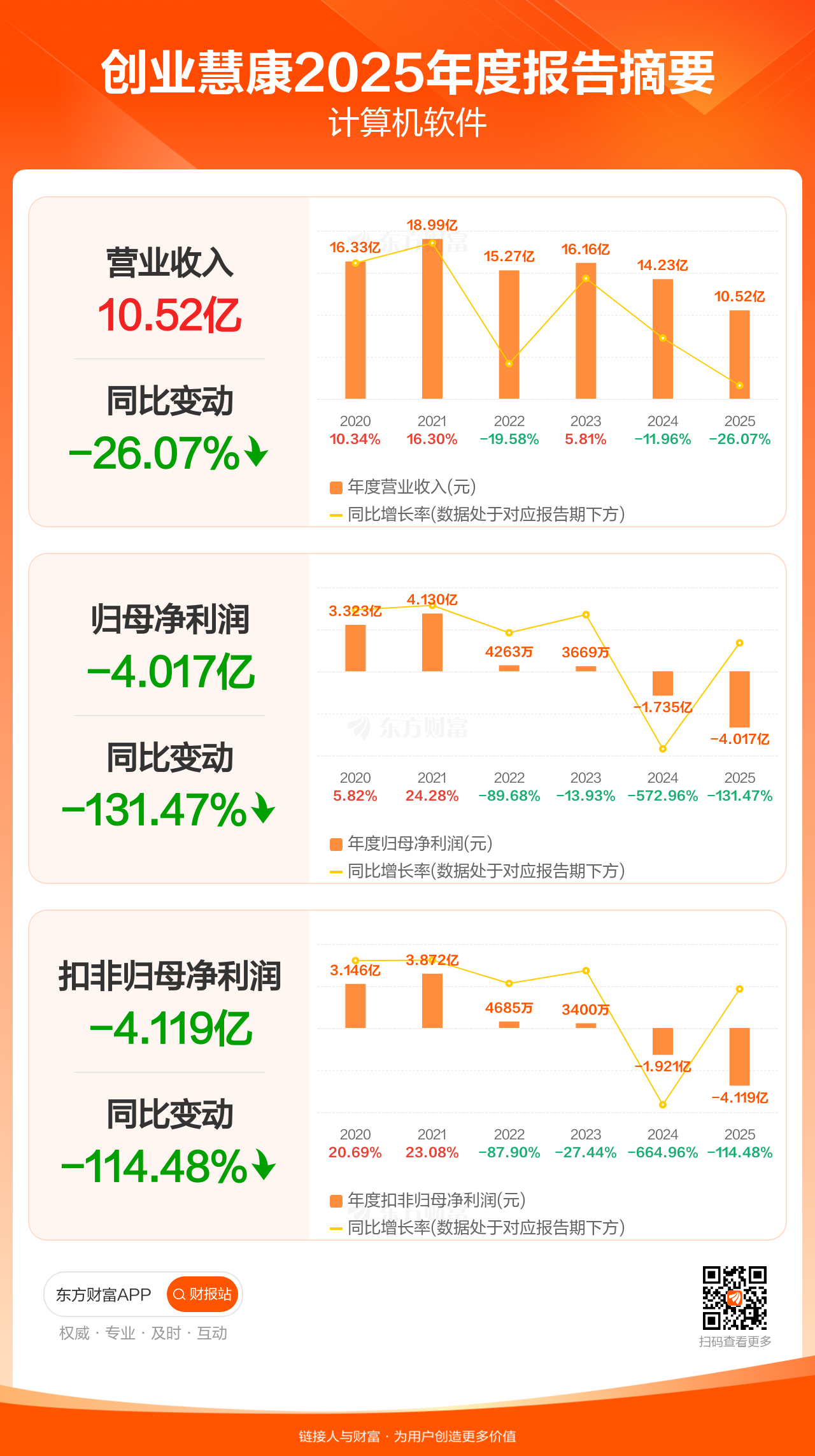 创业慧康4月15日发布2025年年报显示,公司全年实现营业收入10.52亿元,同比下滑26.07%;归母净利润-4.02亿元;扣非归母净利润-4.12亿元。