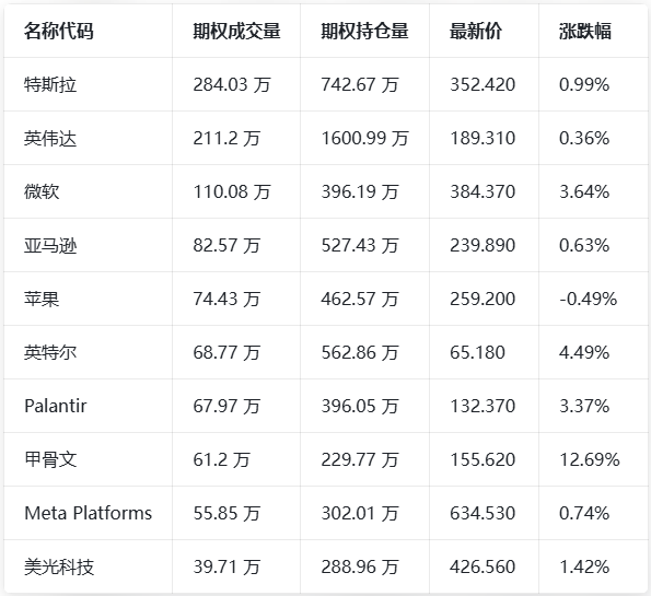 看跌/看涨持仓量比最高的个股为美光科技,达到1.09。美光获多家机构上调目标价至600美元以上,分析师认为AI驱动的存储芯片超级周期有望延续至2027年。