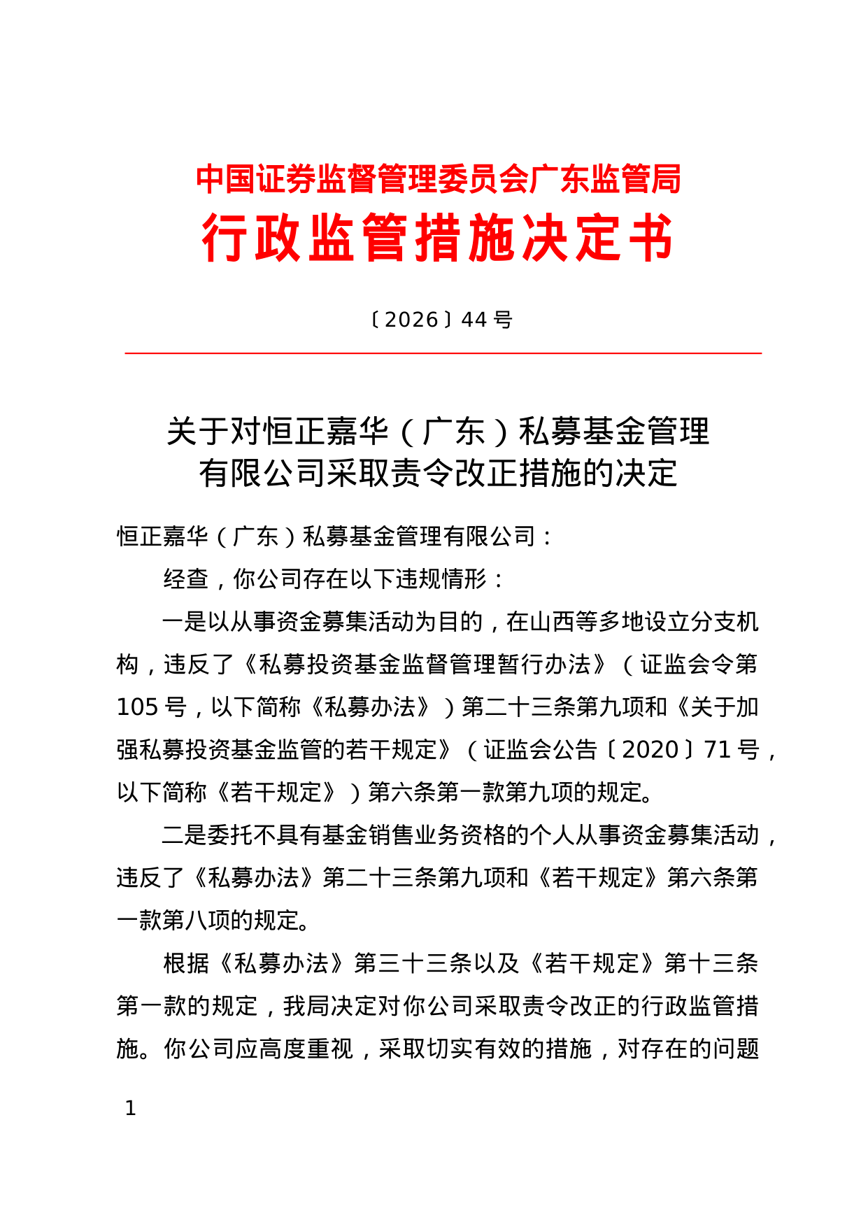对此,广东证监局决定对恒正嘉华(广东)私募基金管理有限公司采取责令改正的行政监管措施。