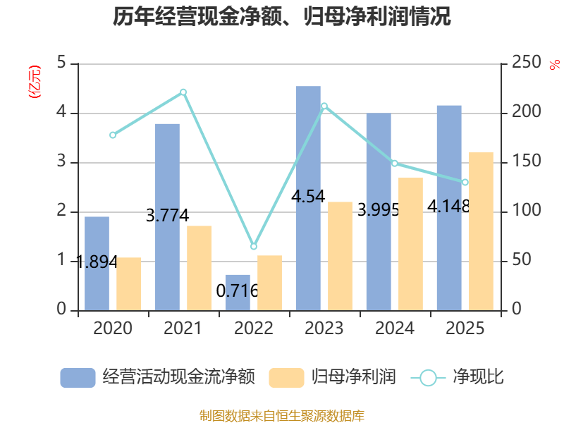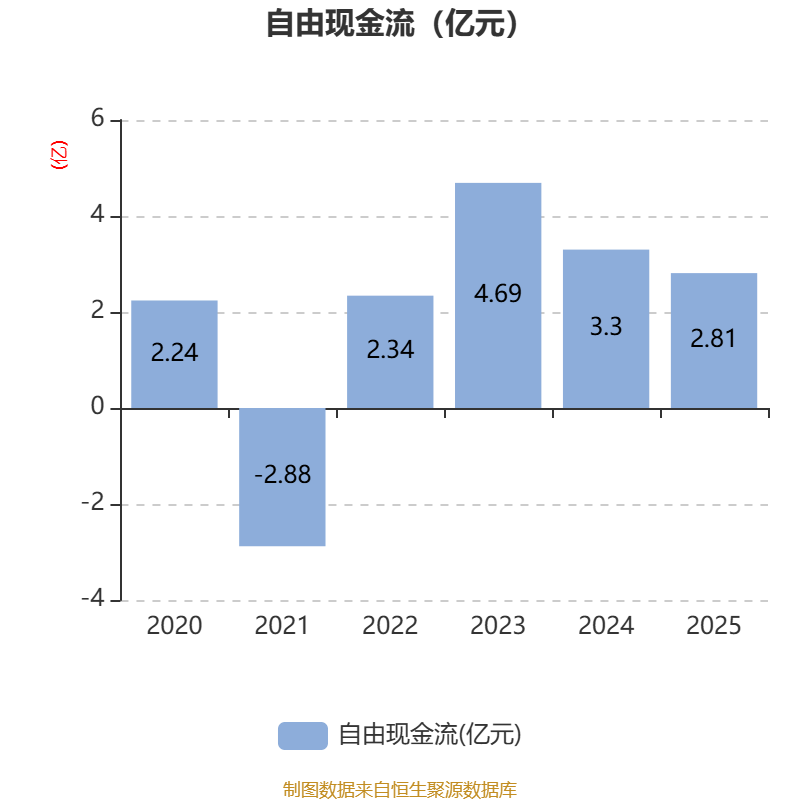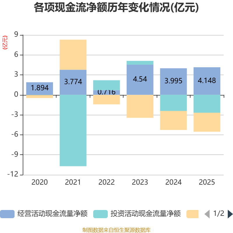 截至2025年,公司经营活动现金流净额为4.15亿元,同比增长3.81%;筹资活动现金流净额-2.85亿元,同比减少2.25万元;投资活动现金流净额-2.69亿元,上年同期为-2.41亿元。
