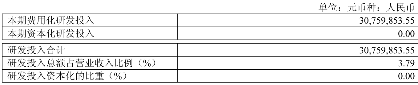 2025年全年,公司研发投入金额为3075.99万元,同比增长42.06%;研发投入占营业收入比例为3.79%,相比上年同期上升1.03个百分点。此外,公司全年研发投入资本化率为0%。