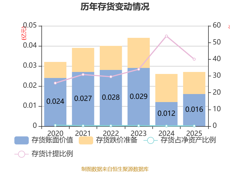 从存货变动来看,截至2025年末,公司存货账面价值为159.39万元,占净资产的0.16%,较上年末增加41.3万元。其中,存货跌价准备为106.4万元,计提比例为40.03%。