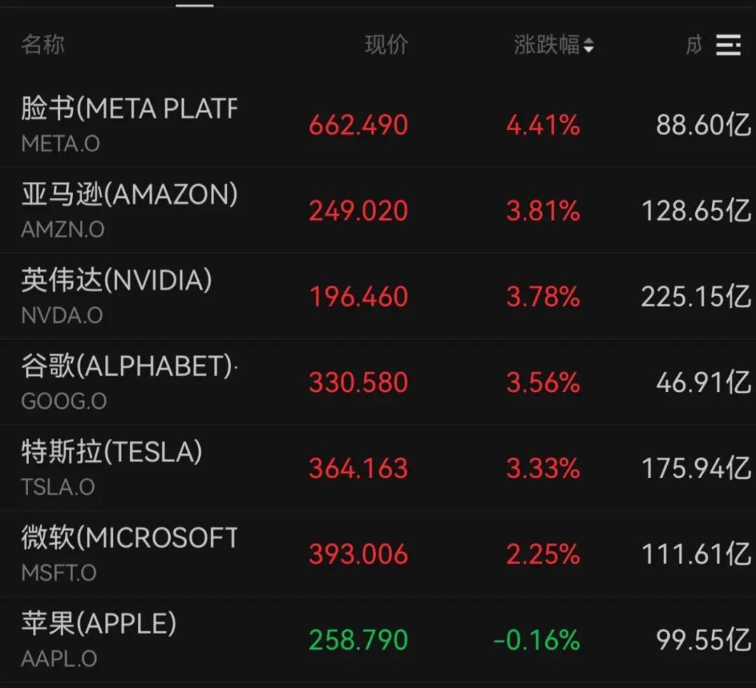 科技“七巨头”集体上涨。脸书涨超4%,亚马逊、英伟达、谷歌、特斯拉涨超3%。