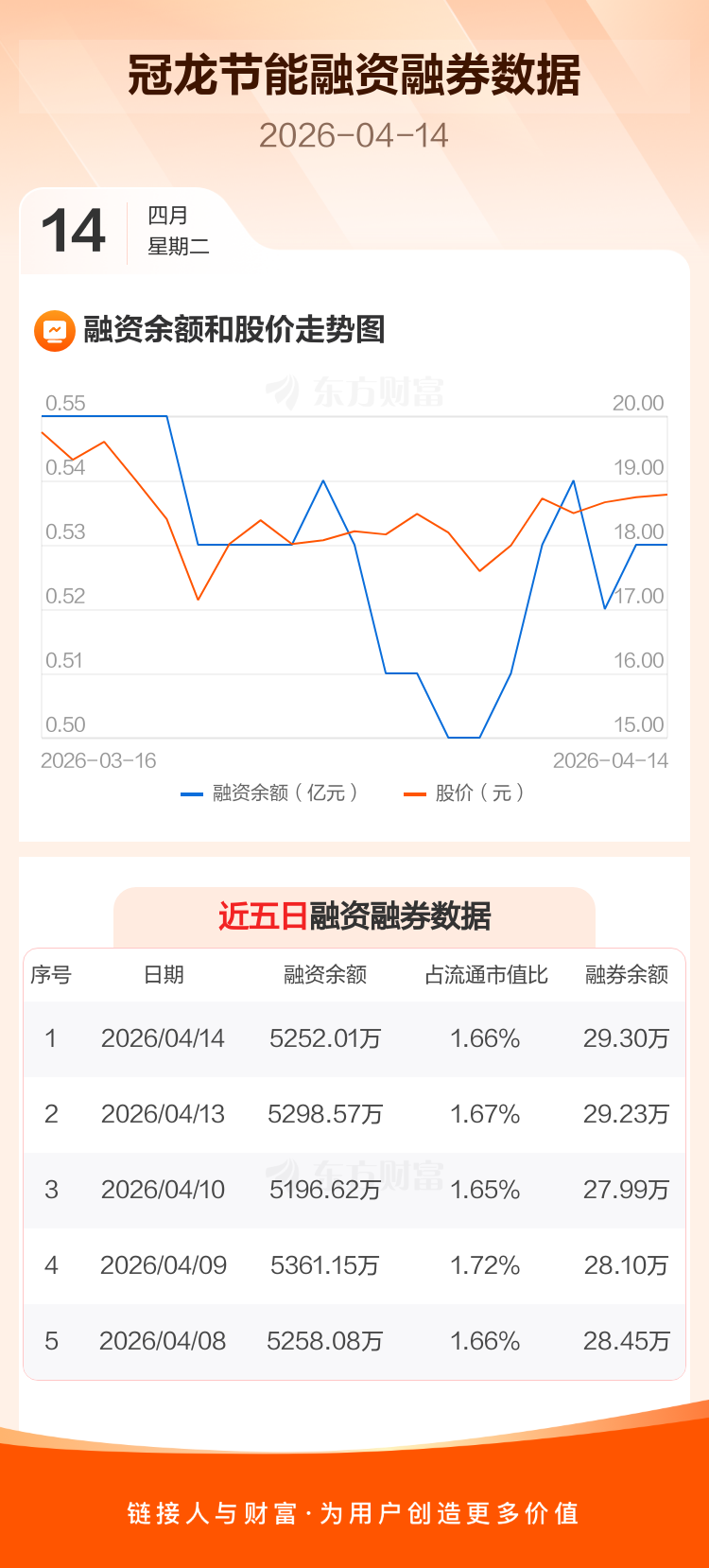 交易所最新数据显示,冠龙节能于2026年4月14日获融资买入158.86万元,融资偿还205.42万元,当日融资净偿还46.56万元。目前,该股融资余额5252.01万,占流通市值比例为1.66%。