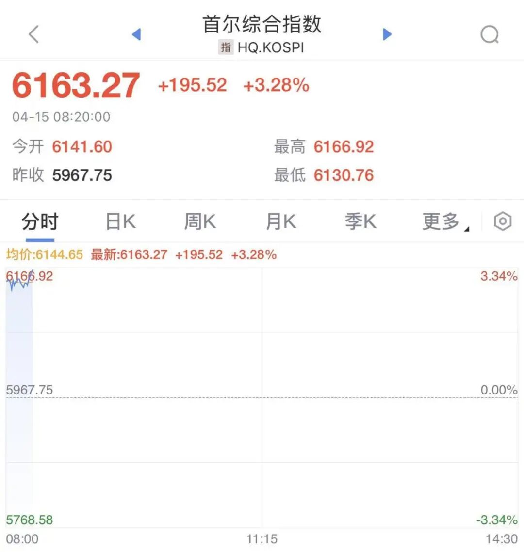 4月15日,日韩股市集体高开,韩国综合股价指数涨超3%,最新报6163.27点。