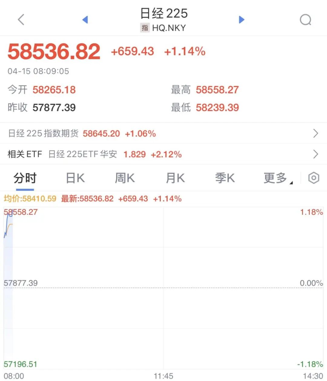 日本股市高开后直线拉升,日经225指数突破58000点,涨幅扩大至1%。