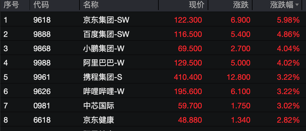 上证报中国证券网讯 4月15日,恒生指数开盘涨1.14%,恒生科技指数涨2.26%。京东集团涨近6%,百度集团、小鹏集团、阿里巴巴涨超4%,携程集团、哔哩哔哩等涨超3%。