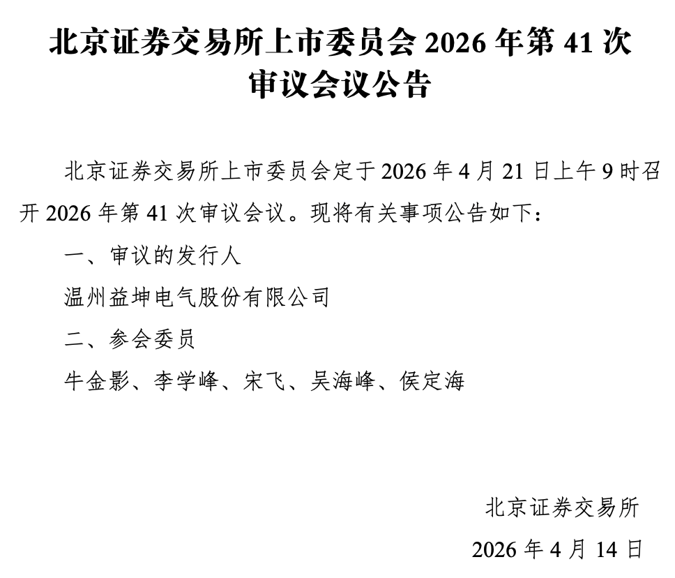 据北交所网站消息,北京证券交易所上市委员会定于4月21日上午9时召开2026年第41次审议会议,审议的发行人为温州益坤电气股份有限公司(简称“益坤电气”)。