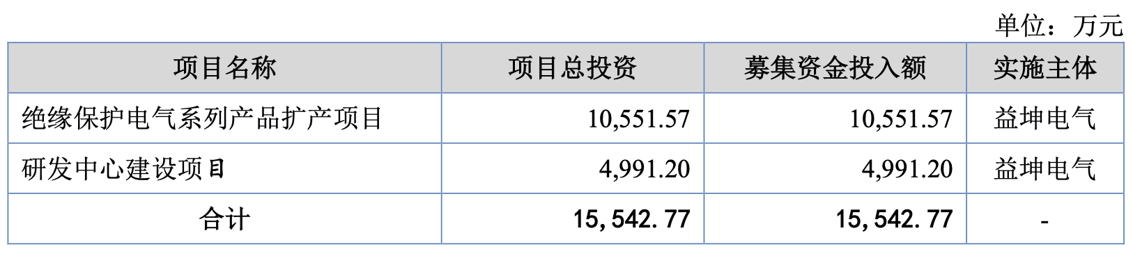 益坤电气还提及,本次募投项目“绝缘保护电气系列产品扩产项目”建设期拟定为24个月,预计T+3年投产、T+5年释放100%产能。但如果未来发生公司市场开拓进展缓慢或相关产品市场需求不足等情形,可能导致新增产能消化不达预期。