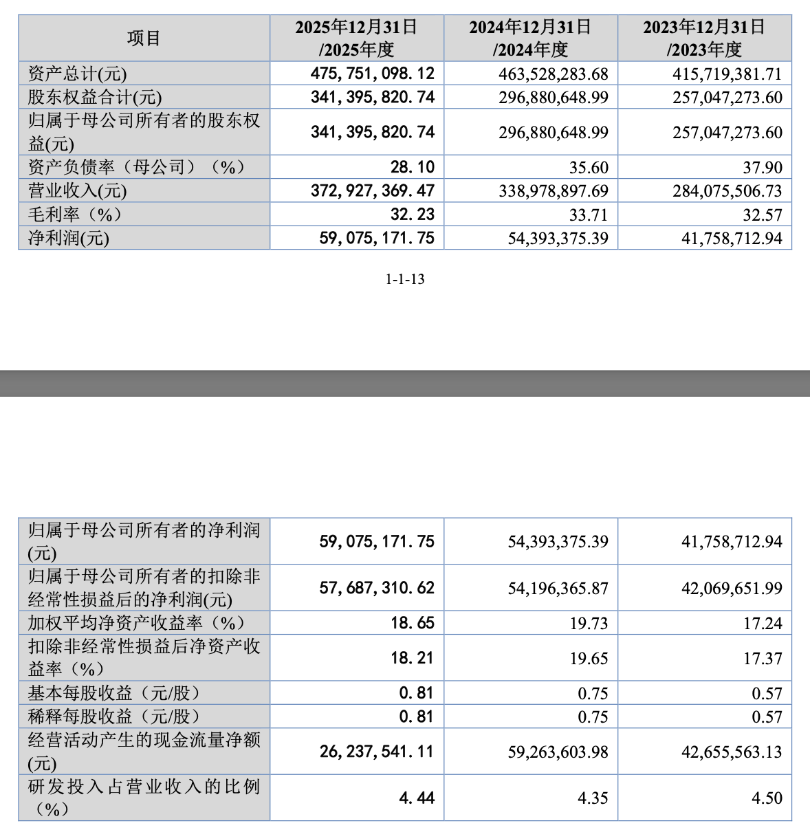 2023年~2025年,公司营业收入分别为2.84亿元、3.39亿元和3.73亿元,扣非净利润分别为4206.97万元、5419.64万元和5768.73万元,整体有所增长。公司综合毛利率分别为32.57%、33.71%和32.23%。