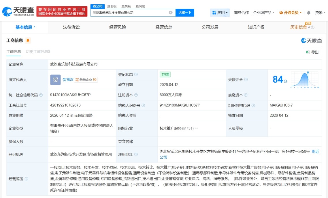 天眼查App显示,近日,武汉富乐德科技发展有限公司成立,法定代表人为贺贤汉,注册资本6000万人民币,经营范围包括电子专用材料研发、新材料技术研发、电子专用设备制造等,由富乐德(301297)全资持股。