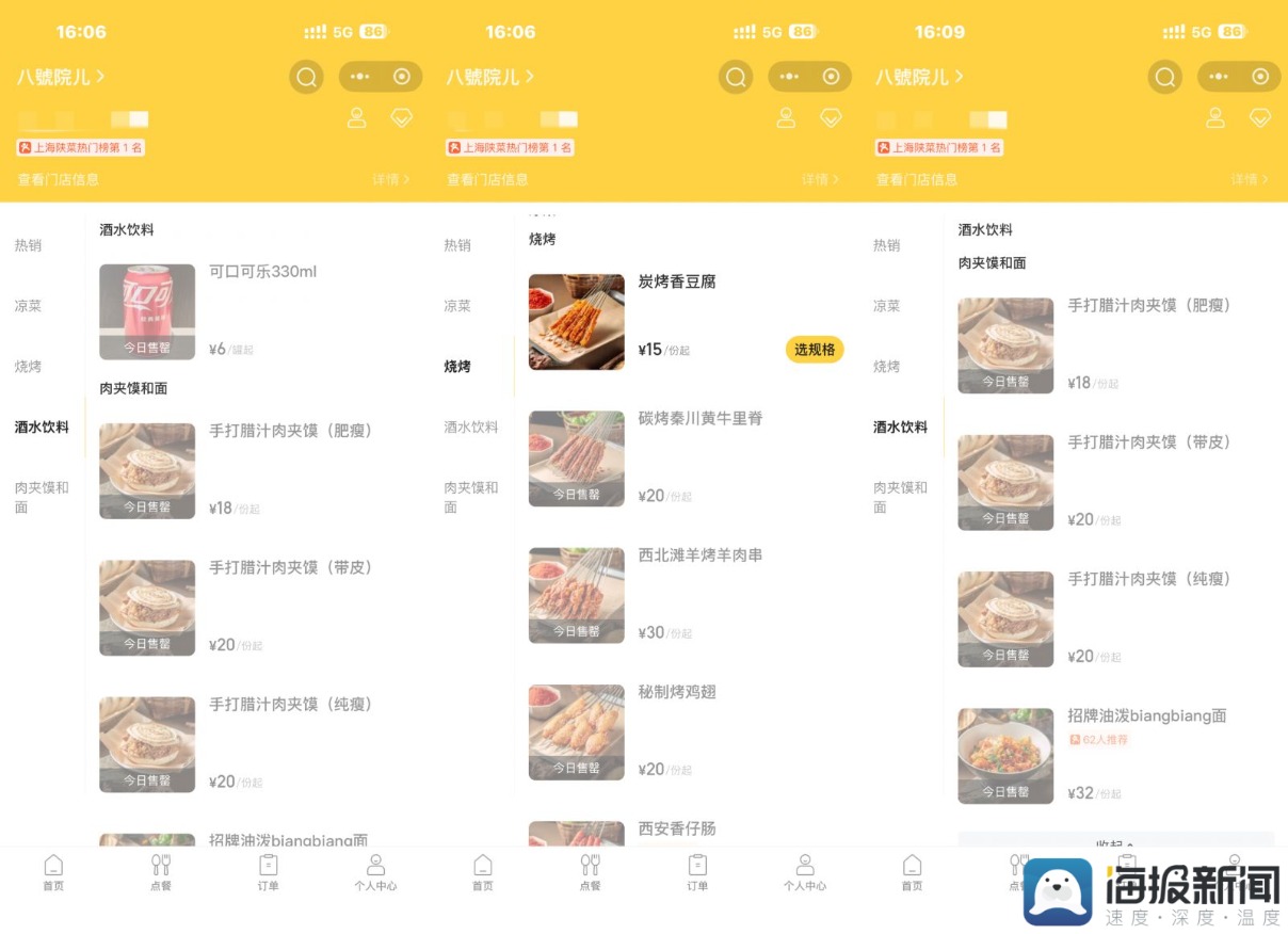 点单程序上面食、肉夹馍及部分烧烤品类均已显示售罄,连可乐也已售罄。