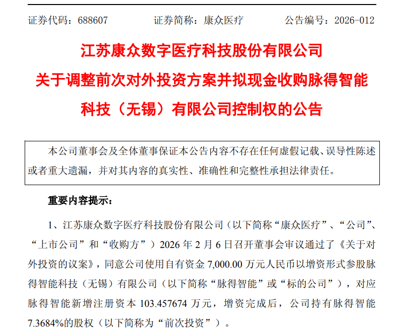 值得注意的是,这一方案较两个月前的投资计划大幅升级。今年2月6日,康众医疗董事会审议通过《关于对外投资的议案》,同意公司使用自有资金7,000万元人民币以增资形式参股脉得智能,对应脉得智能新增注册资本103.457674万元,增资完成后,公司持有脉得智能7.3684%的股权。