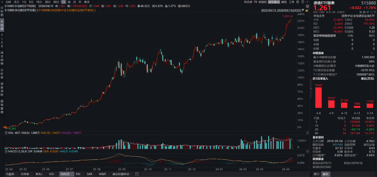 通信板块在AI算力需求持续爆发的驱动下表现强势。4月15日,通信ETF(515880)再创新高,持续吸金,近5日净流入超15亿元。截至4月14日,近一年通信ETF(515880)二级市场涨幅达229.92%,居全市场ETF第一。