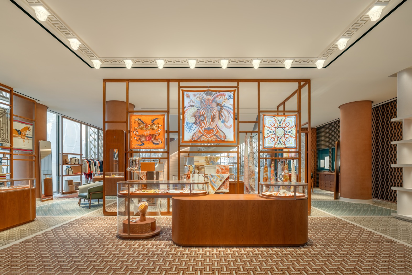 全新专卖店汲取毗邻的紫禁城殿宇建筑特点——弧形琉璃瓦屋脊、暖阳色调与材质的层次感,皆与爱马仕美学风格交相辉映;还有一系列甄选艺术品丰富空间设计。