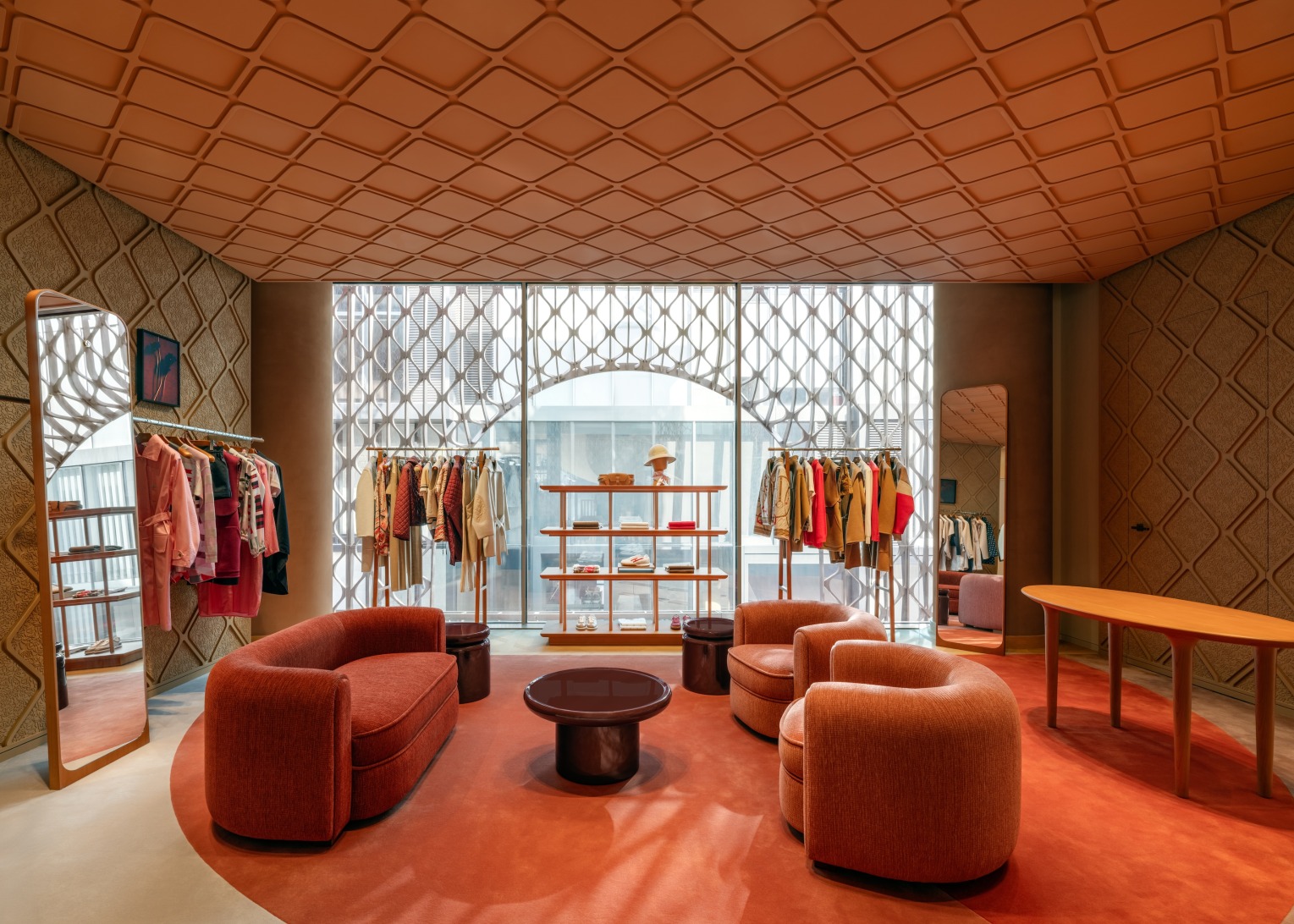 地下一层设有两处入口,以爱马仕标志性藏书章装点,自然开启探访之旅:鞋履与丝织品区域率先映入眼帘,其后则构筑出开阔的香水与美妆区域。一层空间里,活力丝织品世界与马术系列、时尚配饰系列共处其间。上至二层,女士与男士成衣区域紧邻宽敞的鞋履陈列区、温馨试衣间及专属贵宾室。三层空间内陈列家居系列、皮具、腕表及珠宝。顶层空间为专属贵宾室,延伸至绿意盎然的景观露台。