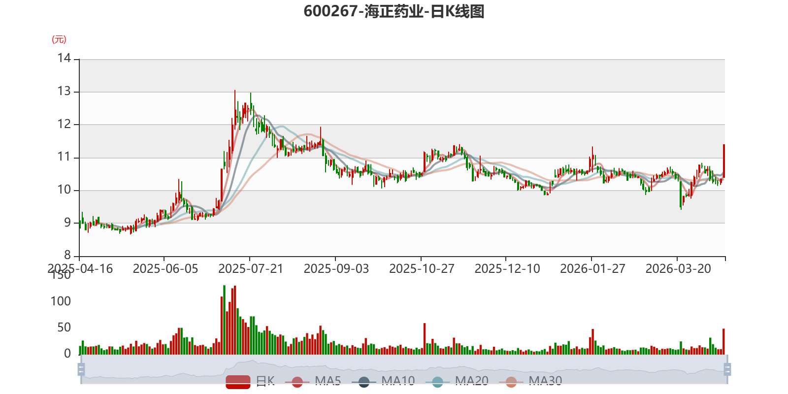 中证智能财讯海正药业(600267)4月15日晚间披露2026年一季度业绩快报,公司实现营业收入23.9亿元,同比下降9.17%;归母净利润3.56亿元,同比增长83.13%;扣非净利润2.36亿元,同比增长29.43%;基本每股收益0.31元,加权平均净资产收益率为4.05%。以4月15日收盘价计算,海正药业目前市盈率(TTM)约为19.45倍,市净率(LF)约1.59倍,市销率(TTM)约1.29倍。