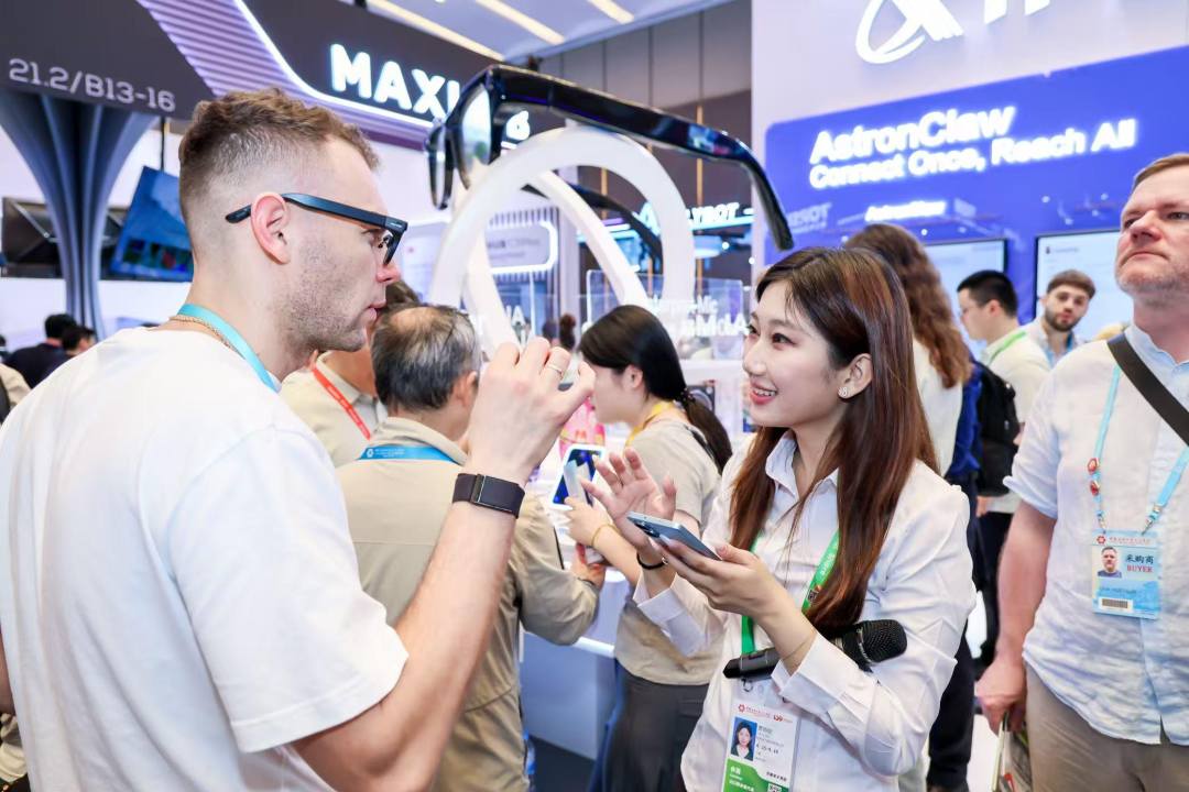 讯飞AI眼镜前始终围满了前来体验的海内外客商。来自巴西、西班牙等数十个国家和地区的采购商排起长队,轮流试戴。