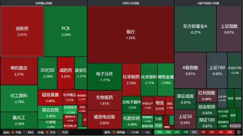 盘面上,创新药、减肥药、单抗概念、化学制药、银行领涨;PCB、化工原料、氯化工、光电子器件、稀有金属、营销服务领跌。