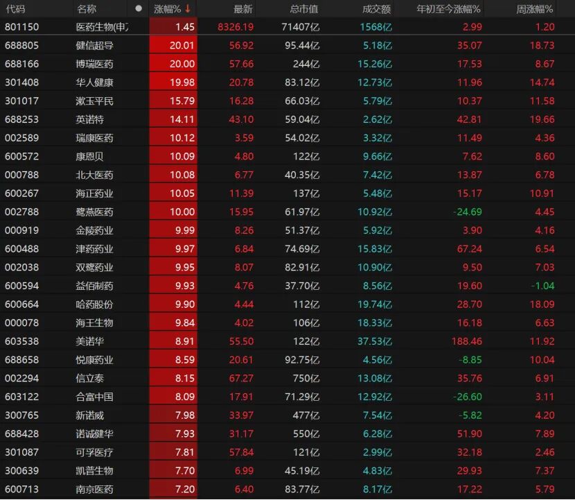 13只医药生物个股涨停,健信超导、博瑞医药、华人健康“20cm”涨停,瑞康医药、康恩贝、北大医药、海正药业等个股也涨停。