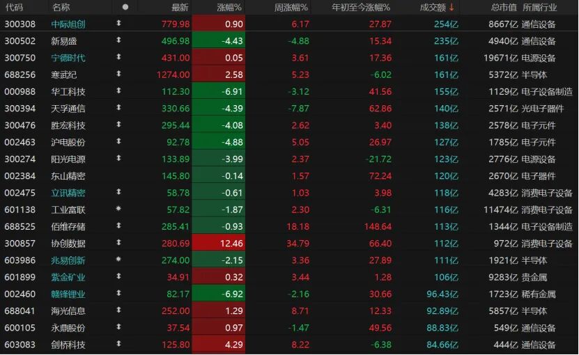 市场亏钱效应明显,共计1841只个股收涨,涨停股68只;3541只个股收跌,跌停股14只。16只个股日成交额超100亿元,主要为科技股,且跌多涨少:新易盛跌逾4%,华工科技跌近7%,阳光电源跌近4%报133.89元/股。