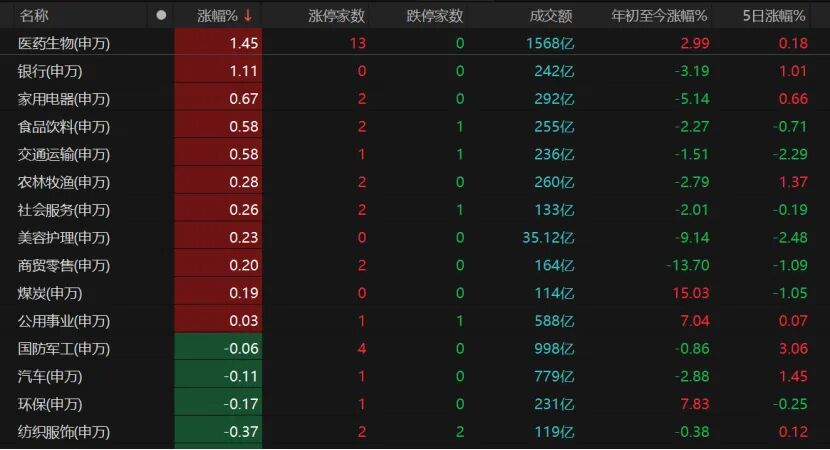 盘中资金切换明显:医药生物、银行震荡走高领涨,化工、通信、有色等是震荡低走领跌;石油石化、房地产、建筑材料均超1%。