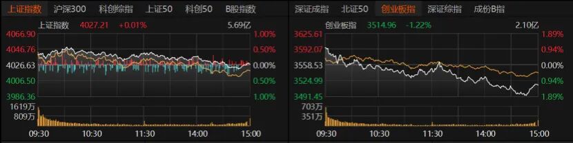 今日指数高开低走。沪指涨幅收窄至0.01%;创业板指翻绿收跌1.22%,报3514.96点;深证成指收跌0.97%。上证50、科创50微红,但沪深300、北证50微跌。