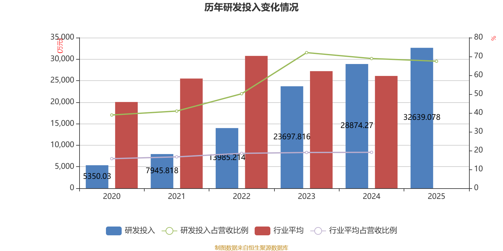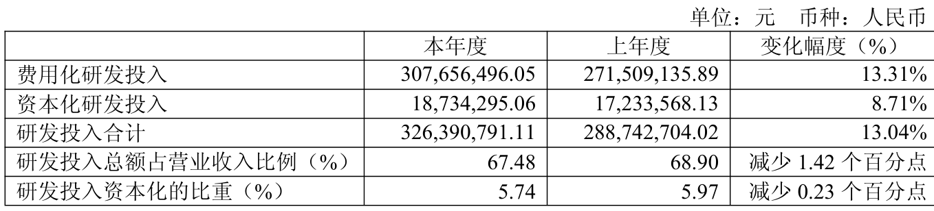 2025年全年,公司研发投入金额为3.26亿元,同比增长13.04%;研发投入占营业收入比例为67.48%,相比上年同期下降1.42个百分点。此外,公司全年研发投入资本化率为5.74%。